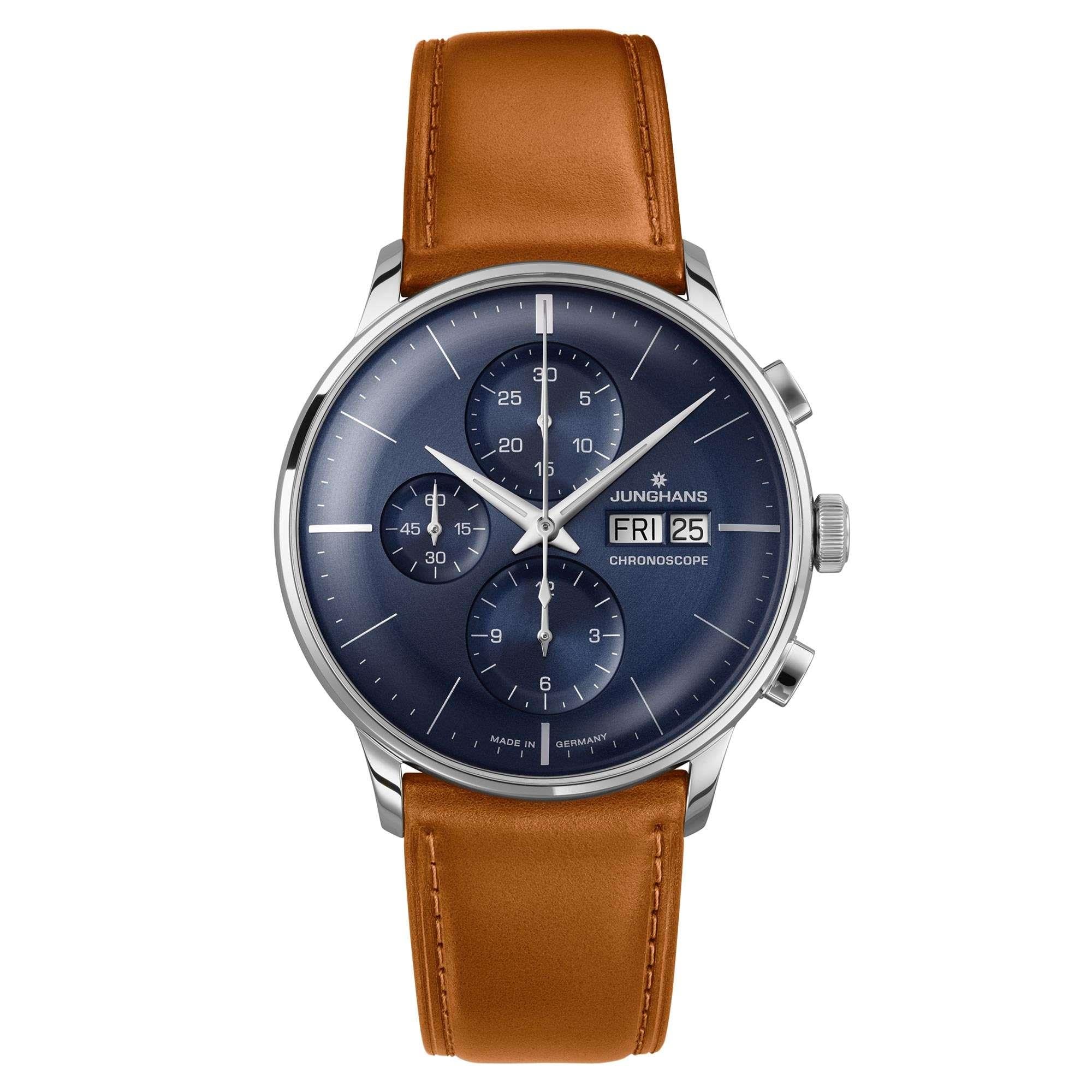 Junghans Meister Chronoscope Mechanical Hand Wind Blue Dial Brown Leather Strap Men's Watch 027/4526.01