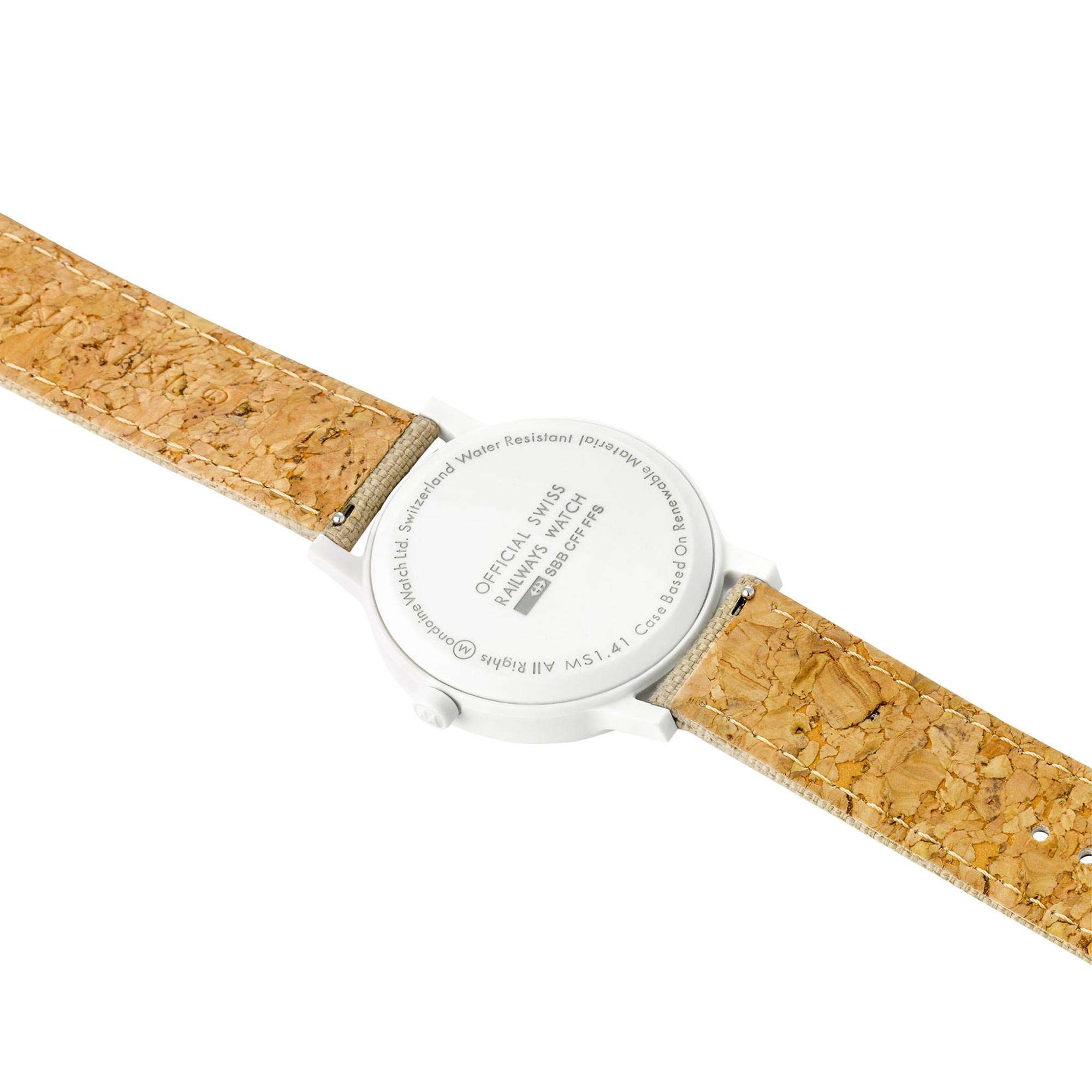 Mondaine Essence Watch MS1.41110.LS features a 41mm white case that is crafted from a Bio based polyamide. A white gasket crown is present on the edge of the case, besides the 3 o’clock marker. It has been embossed with a white Mondaine logo, which incorporates the brand's iconic design. Hardened mineral crystal glass sits on top of the case, which is a material renowned for its durability.