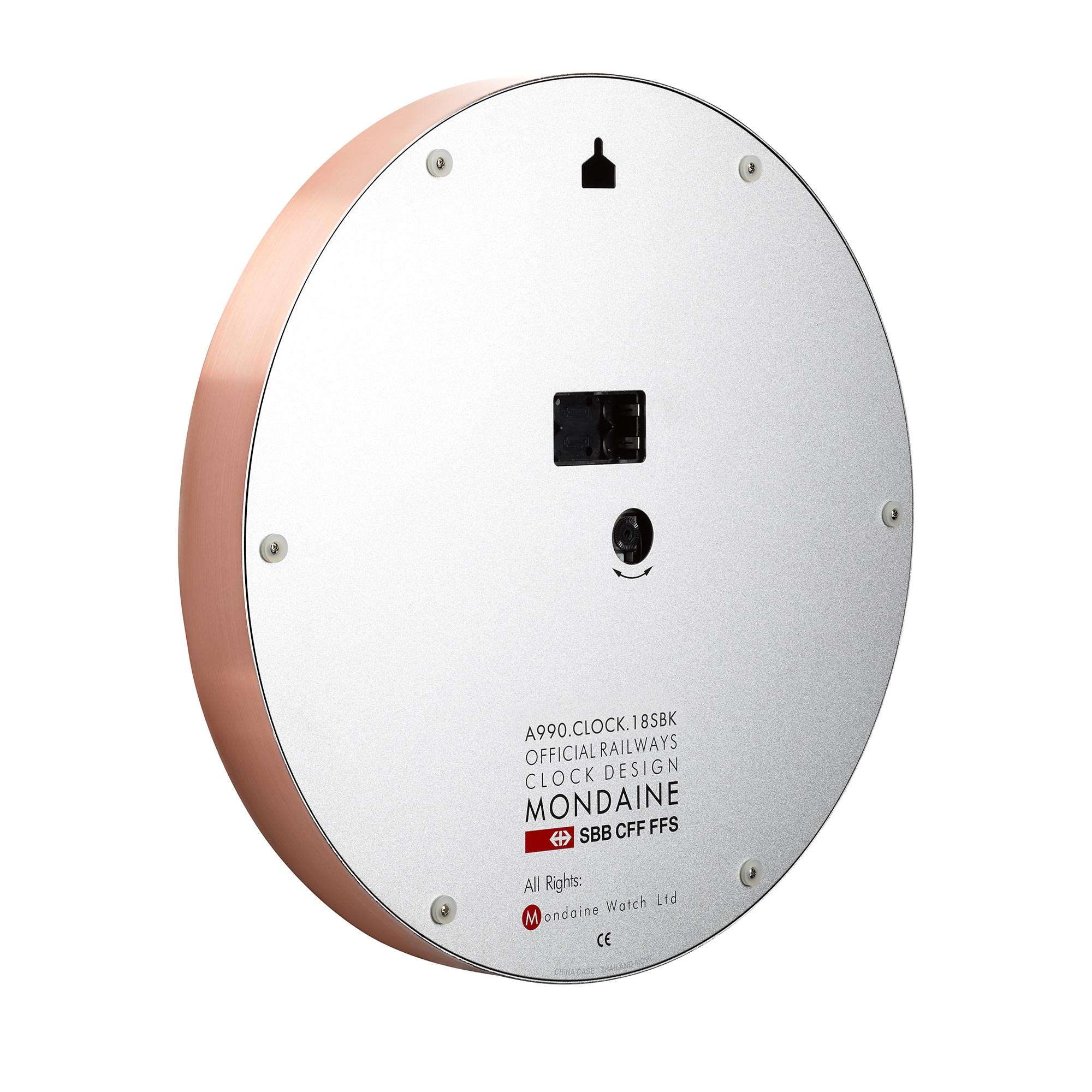 Mondaine Bronze Clock A990.CLOCK.18SBK White Dial 25cm Case adds minimalist Swiss style and functionality to your home. It is made from circular brushed rose gold aluminium and it measures 25cm in diameter. Hardened mineral crystal glass protects the dial from shattering and scratches.