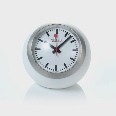 The Mondaine Globe Clock introduces a touch of Switzerland to any space, showcasing iconic Swiss design inspired by the legendary Official Swiss Railways Clock. Reflecting a minimalist Bauhaus aesthetic, it features a 49.5mm dial set within a rounded 60mm white silicone base, creating a refined and timeless silhouette. Powered by a precise Swiss quartz movement, its removable clock head allows for effortless adjustment and repositioning. Ideal for placement on a desk, bedside table, or bookshelf, the Globe Clock embodies clarity, calm, and heritage, an authentic expression of Swiss craftsmanship at its finest.