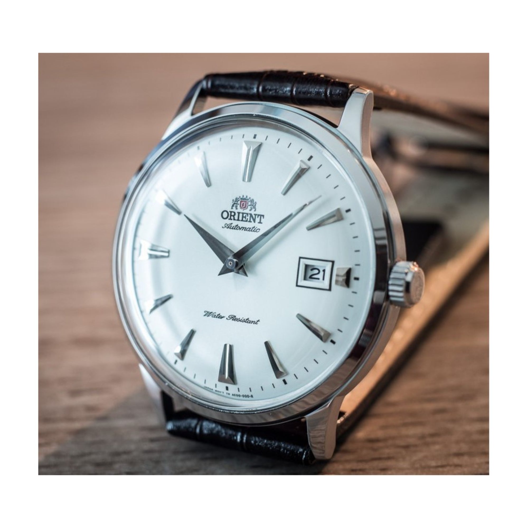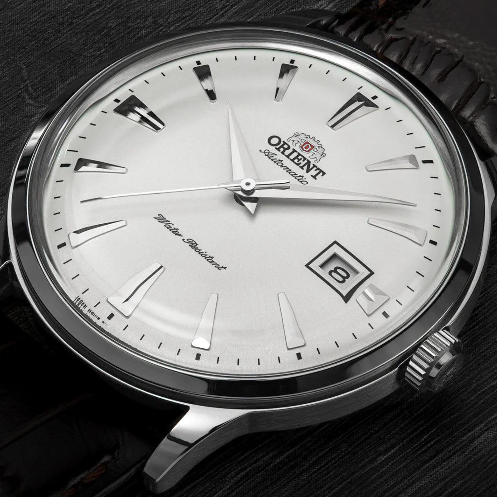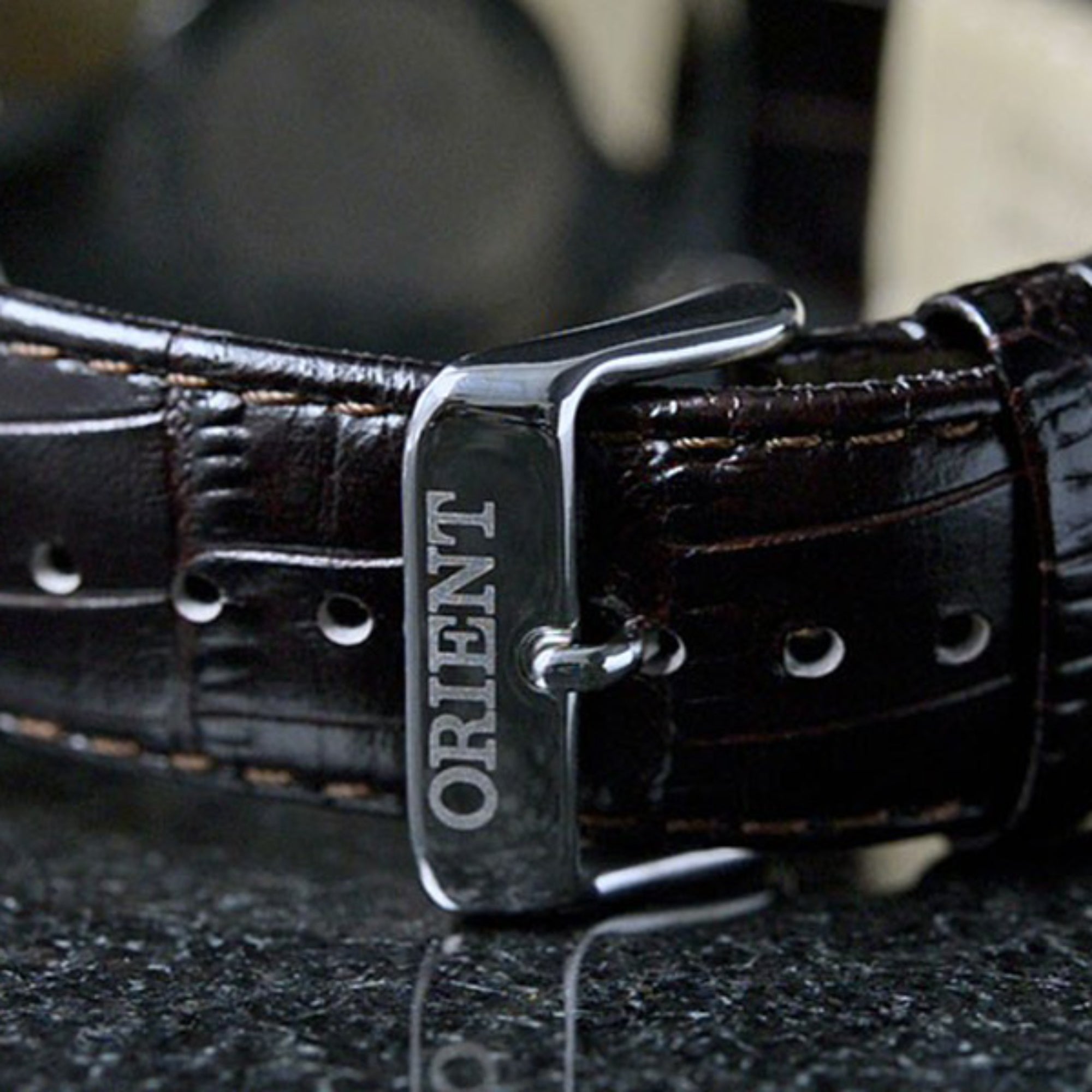 The dial is presented in white with an elegant polished finish. It showcases an understated layout that is exemplified through a polished, bevelled dauphine handset and silver baton-style hour markers. It also features a 60-second track that is located around the edge of the dial and a black-framed date window that is located beside the 3 o’clock marker. The Orient logo is proudly situated beneath the 12 o’clock marker.