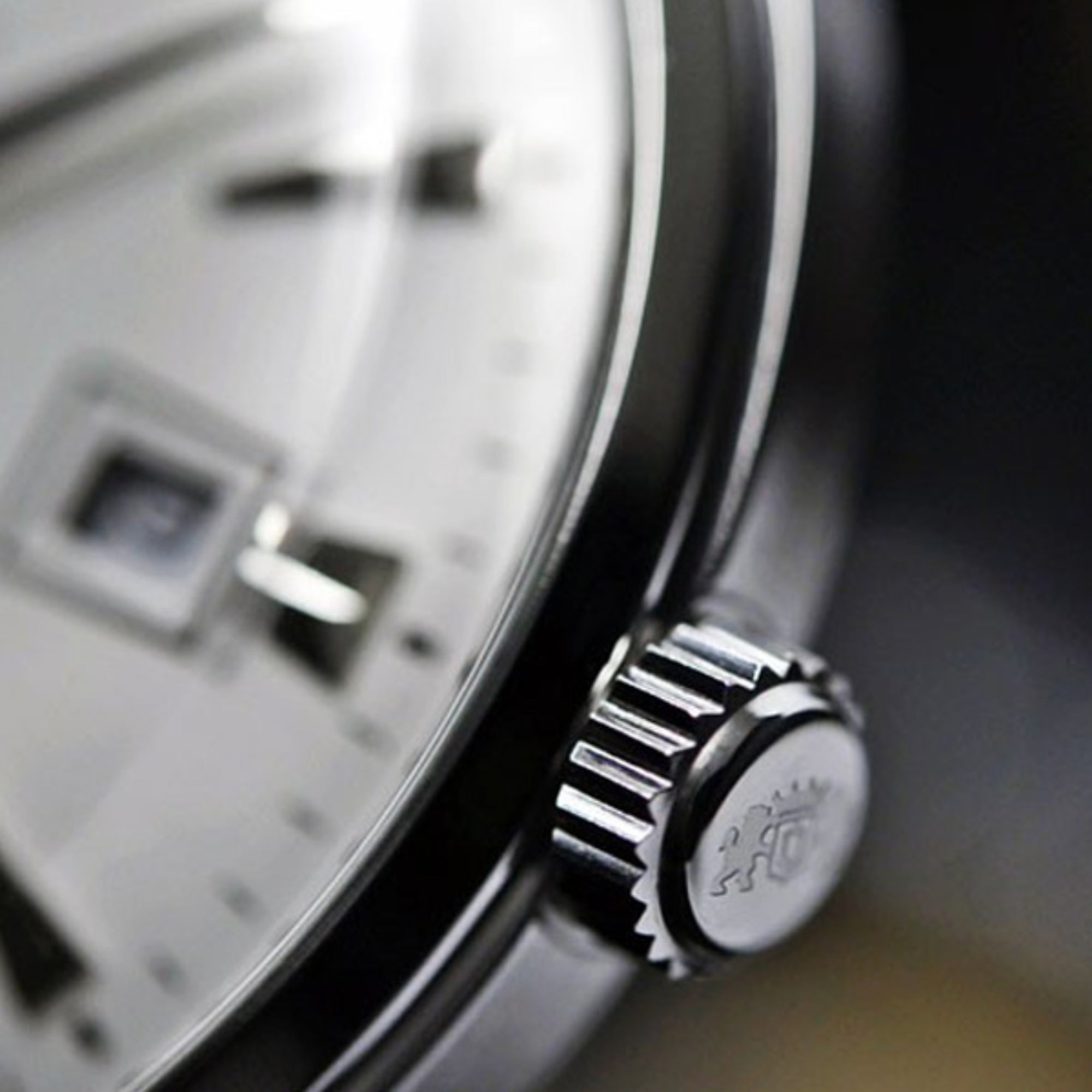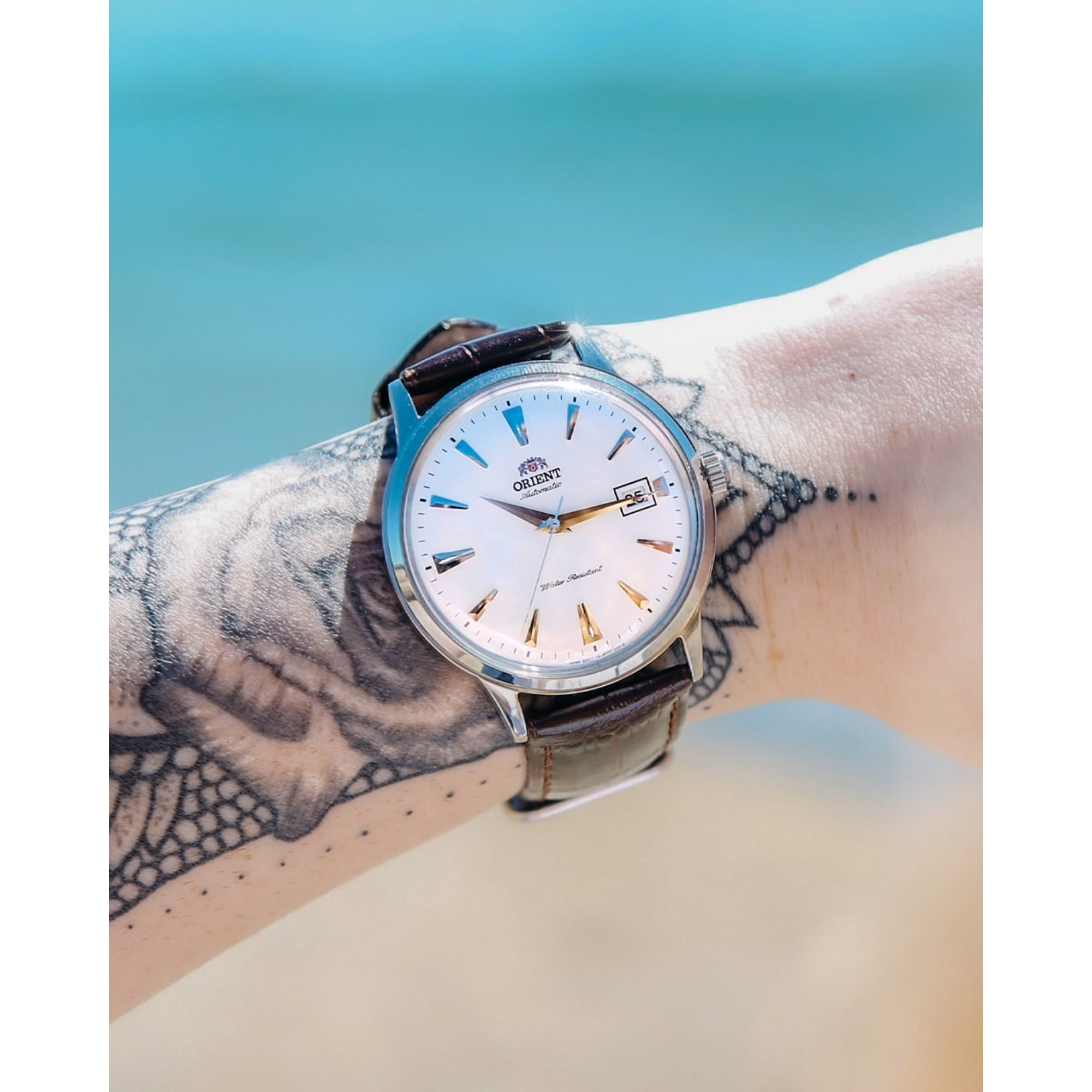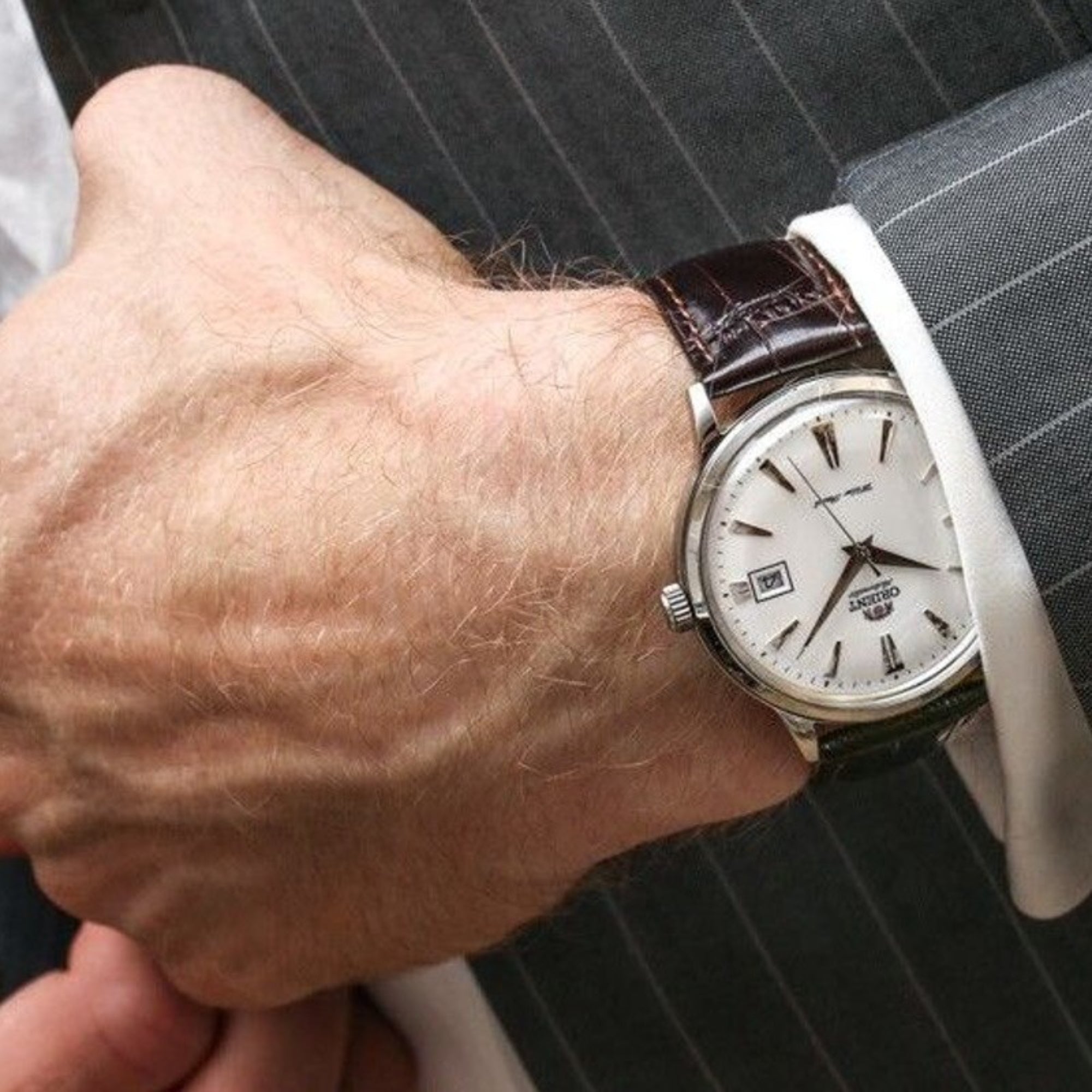 The dial is presented in white with an elegant polished finish. It showcases an understated layout that is exemplified through a polished, bevelled dauphine handset and silver baton-style hour markers. It also features a 60-second track that is located around the edge of the dial and a black-framed date window that is located beside the 3 o’clock marker. The Orient logo is proudly situated beneath the 12 o’clock marker.