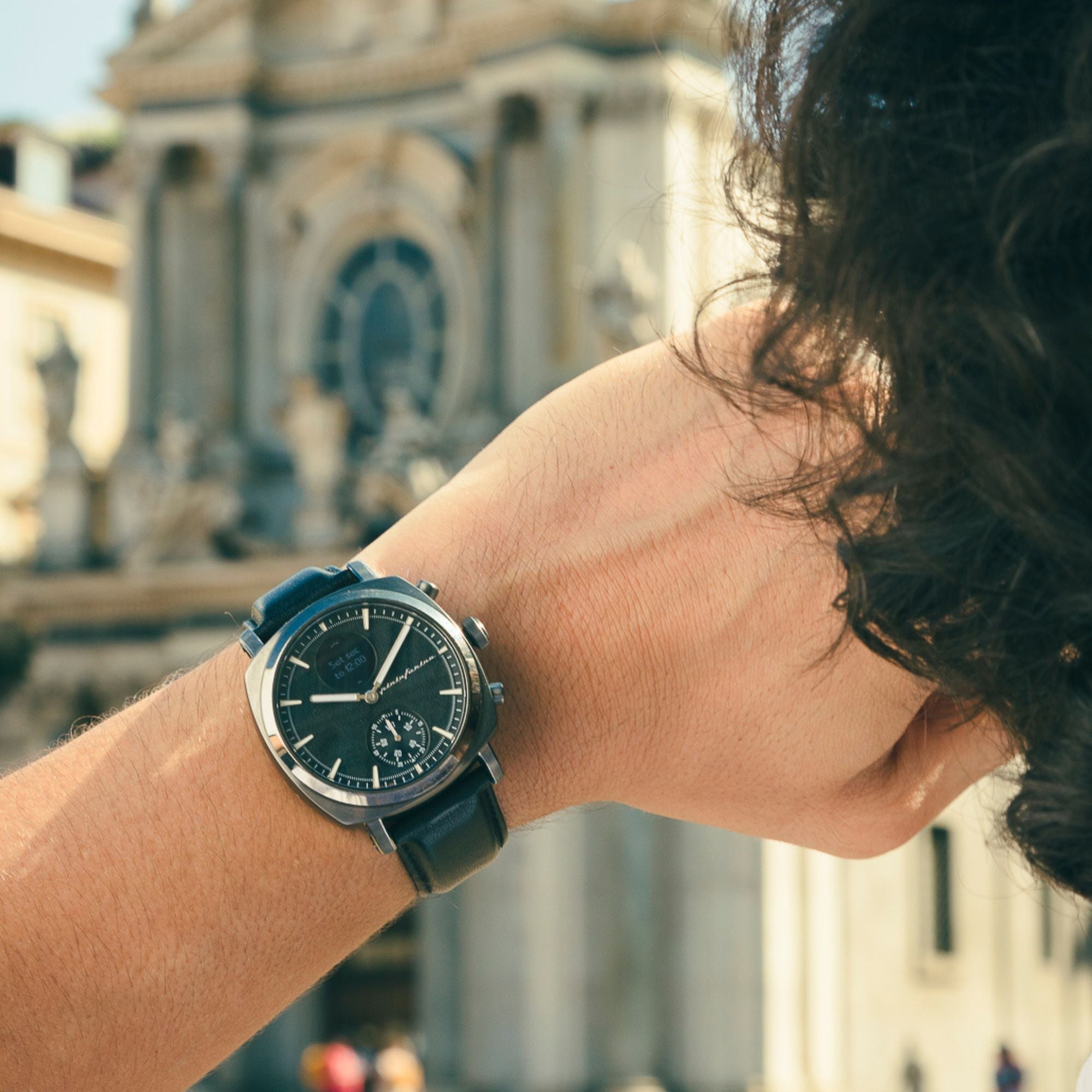 The Pininfarina Senso Hybrid PMH01A-04 is housed in a 316L gunmetal grey PVD stainless steel case that measures 44mm in diameter and 16mm in thickness. The body of the case has been treated to a brushed finish, whilst the fixed bezel that sits at the top of the case has been treated to a polished finish creating a striking visual contrast. A knurled crown is located at 3 o’clock, in between two push buttons located at 2 and 4 o’clock that can be used to interact with the dial’s functions. Sapphire crystal glass provides the dial with protection against scratches and shattering.
