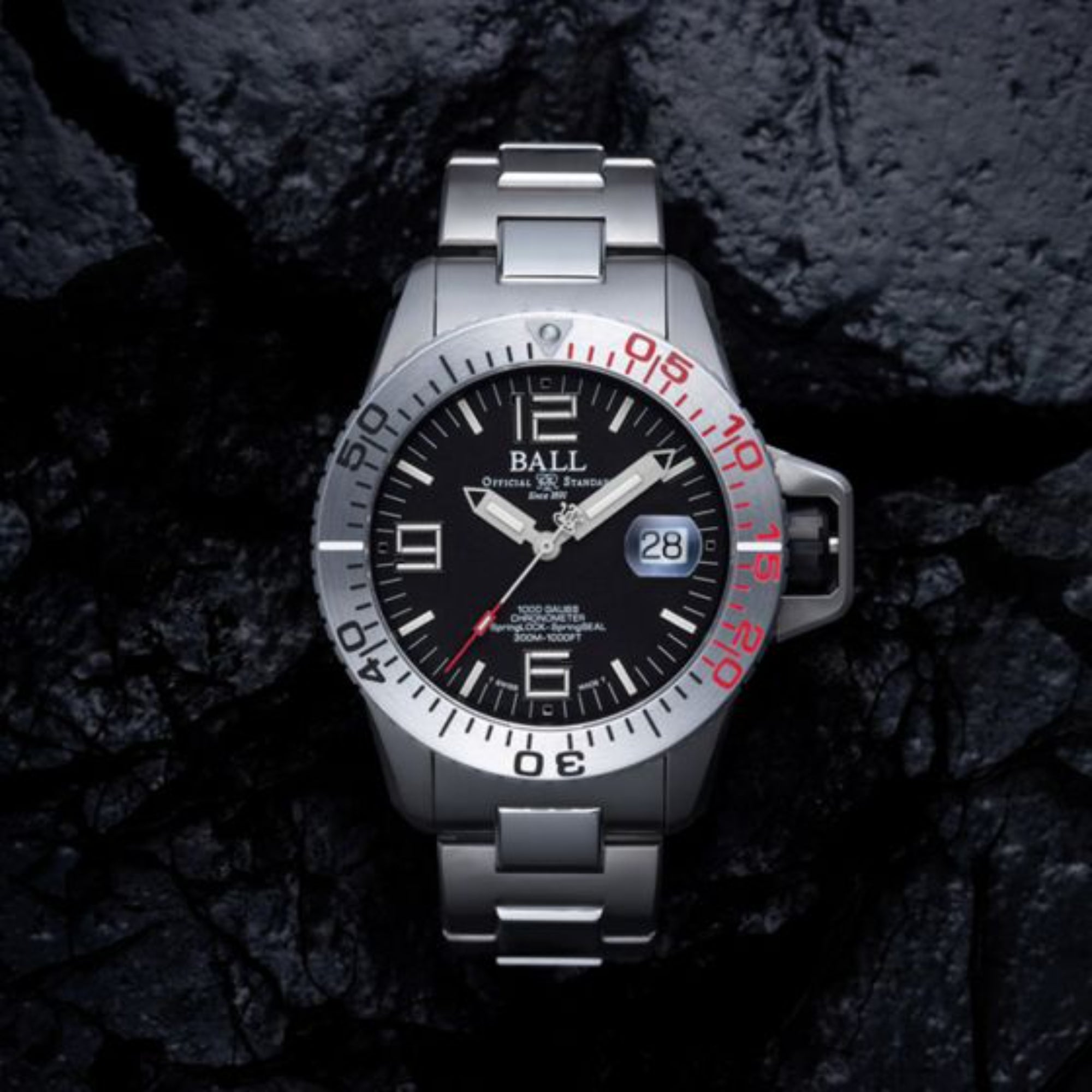 It is presented on a tapered h-link bracelet that is crafted from a combination of titanium and stainless steel. It displays both brushed and polished finishes that bestows a visual contrast and enhances the overall aesthetics of the watch. It secures around the wrist through the use of Ball’s patented folding buckle.