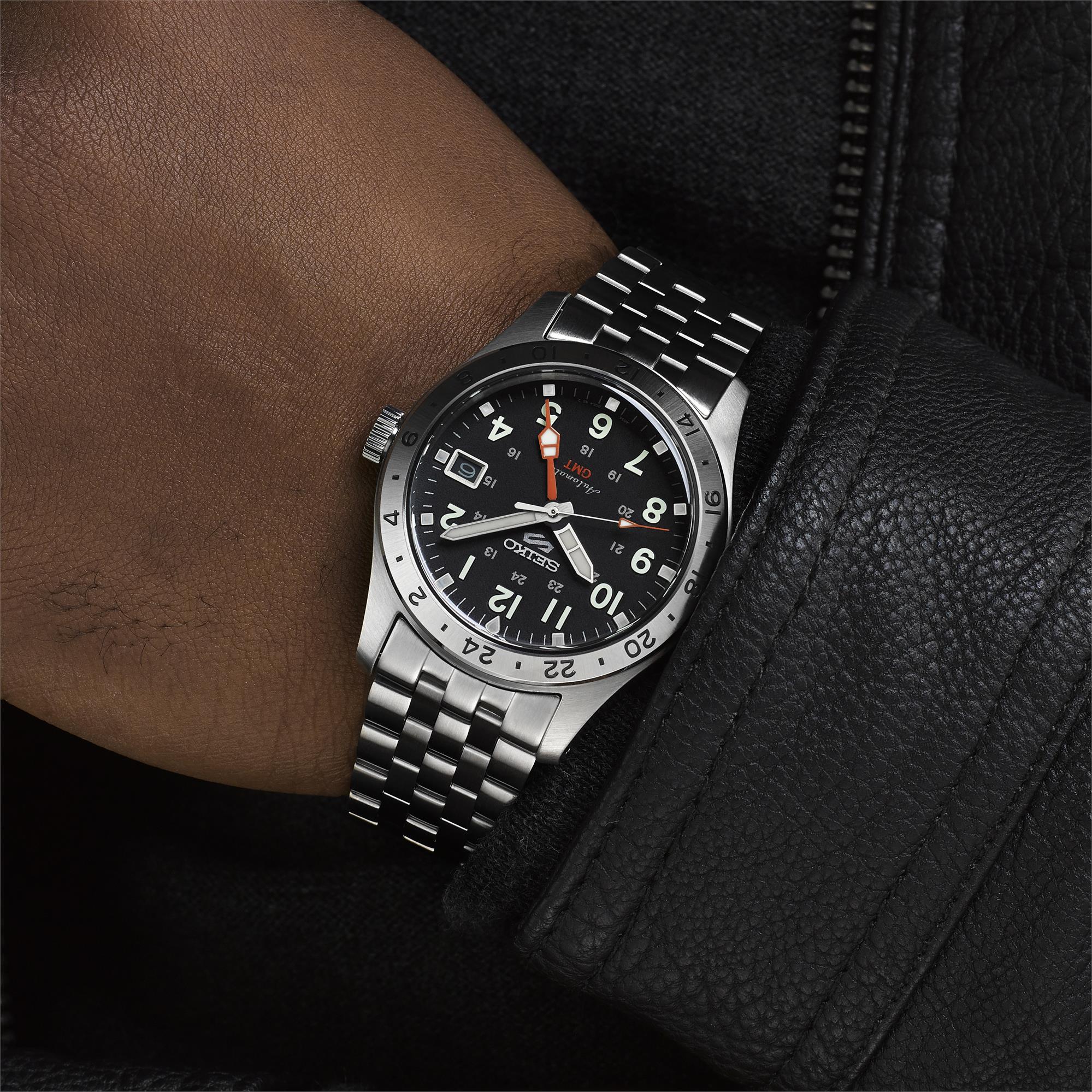 The watch exhibits a black dial with a grainy finish and a GMT function, which allows the wearer to track multiple time zones simultaneously. To use the GMT function, set the orange GMT hand to the desired second time zone using the watch's crown, with reference to the 24-hour scale on the bezel.