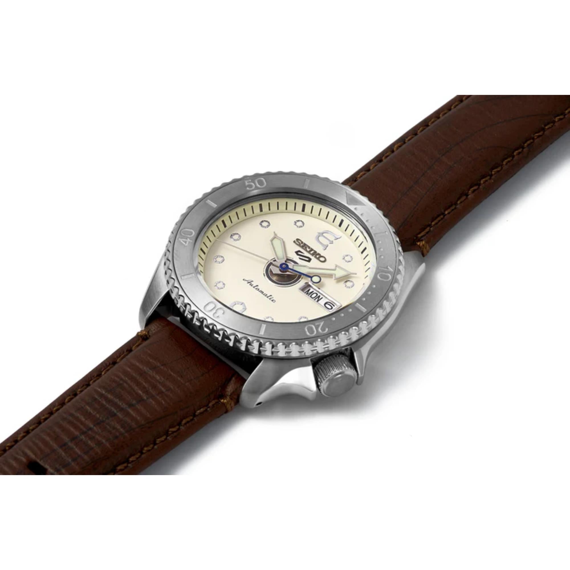 Seiko 5 Sports Evisen Skateboard Limited Edition Automatic Cream Dial Leather Strap Men's Watch SRPF93K1