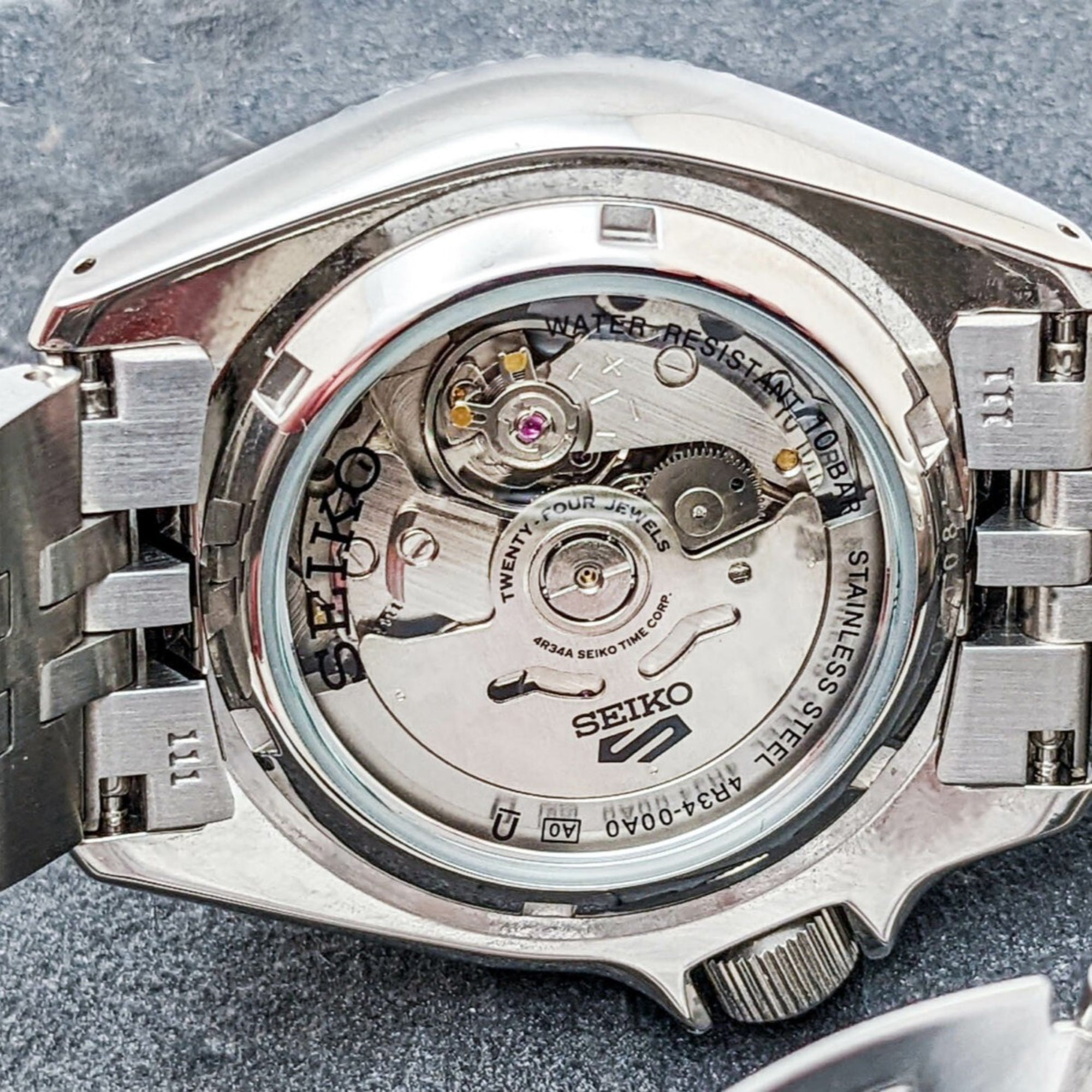 The Seiko 5 Sports GMT SSK005K1 is presented in a 42.5mm brushed stainless steel case. It features a black unidirectional rotating bezel that exhibits a gilt 24-hour display that can be used to set the time for another time zone. The bezel is made out of aluminium. The coined walls of the bezel ensure that it is easily operable. A pushdown crown is located at 4 o’clock, it is flanked by a crown guard which ensures that it is not knocked out of place. Hardlex crystal also provides the front and the back of the case with protection against scratches and shattering. The exhibition caseback provides the wearer with an insight into the inner mechanisms of the watch.