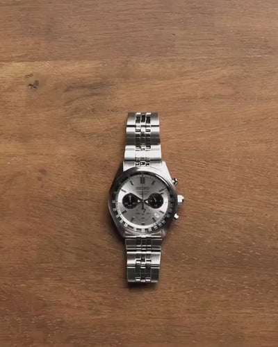 The Seiko SSB425P1 blends clean, modern styling with a classic motorsport-inspired aesthetic. Its standout feature is the silver-white dial paired with contrasting black sub-dials, creating a striking panda-style design that instantly enhances visual depth and readability. The stainless-steel case and bracelet add a refined feel, while the black tachymeter ring reinforces its sporty chronograph character. Polished indices and hands catch the light beautifully, and the red-tipped chronograph seconds hand adds a sharp, energetic accent.