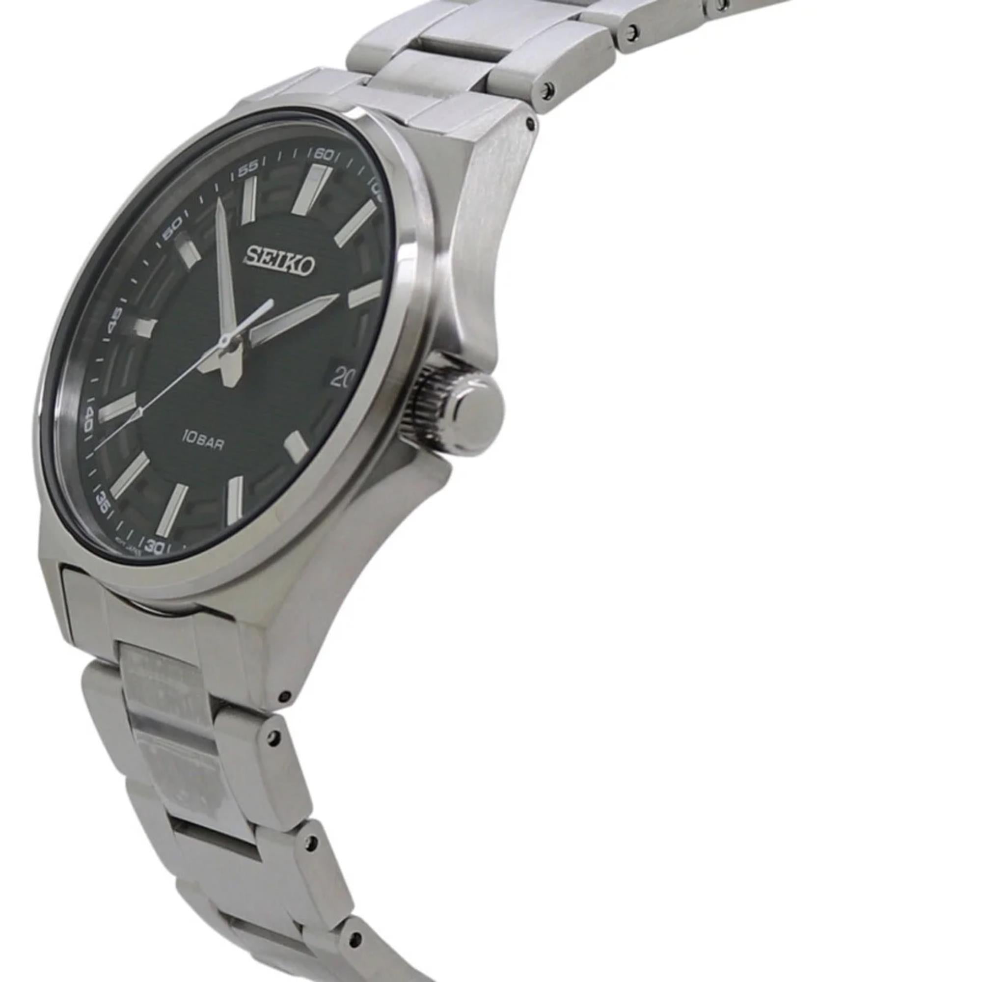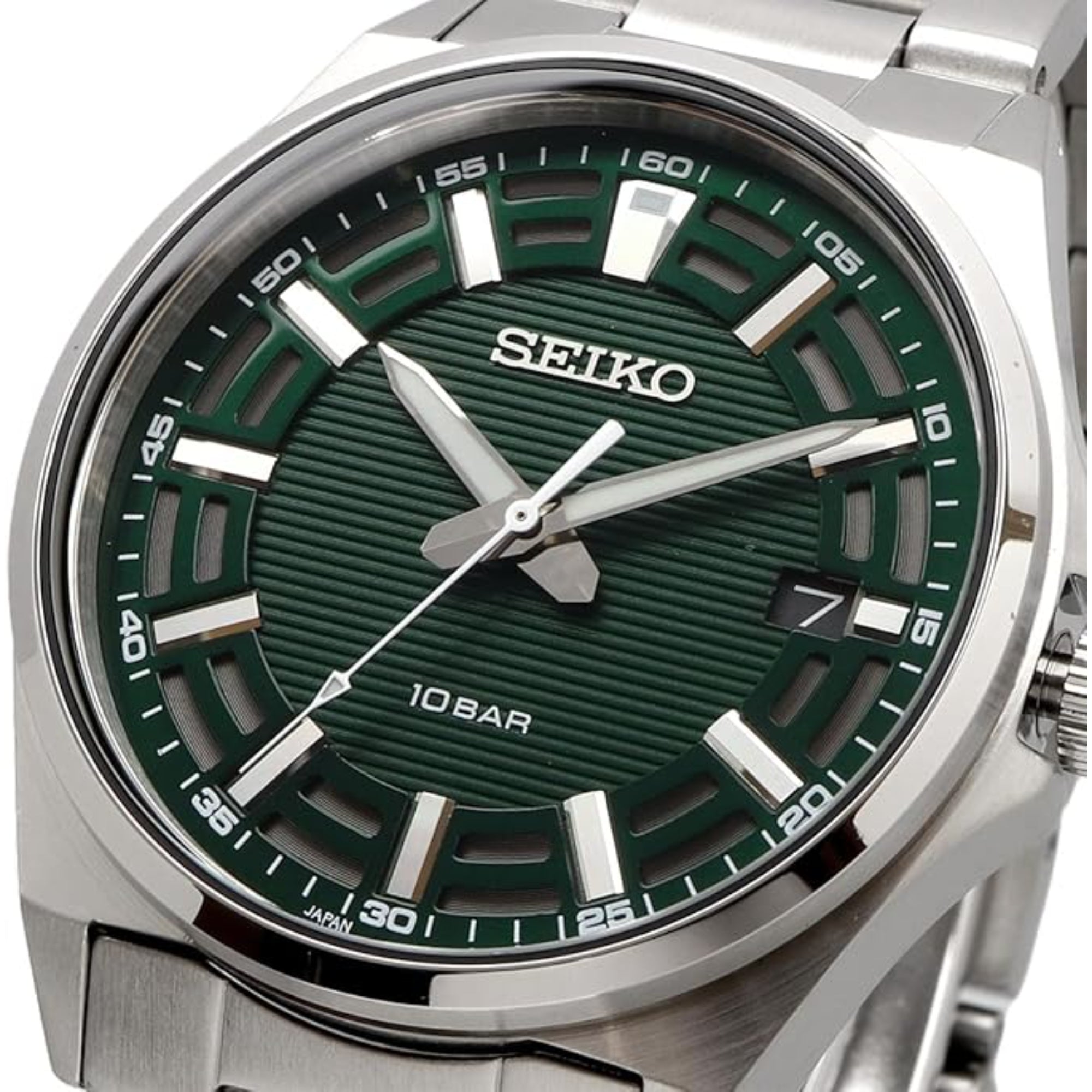 The Seiko SUR503P1 is a stylish and functional men's watch, offering a sophisticated green dial paired with a stainless steel strap. With its reliable quartz movement, sleek design, and versatility, this timepiece is perfect for those looking for a watch that offers both style and dependability in one package.