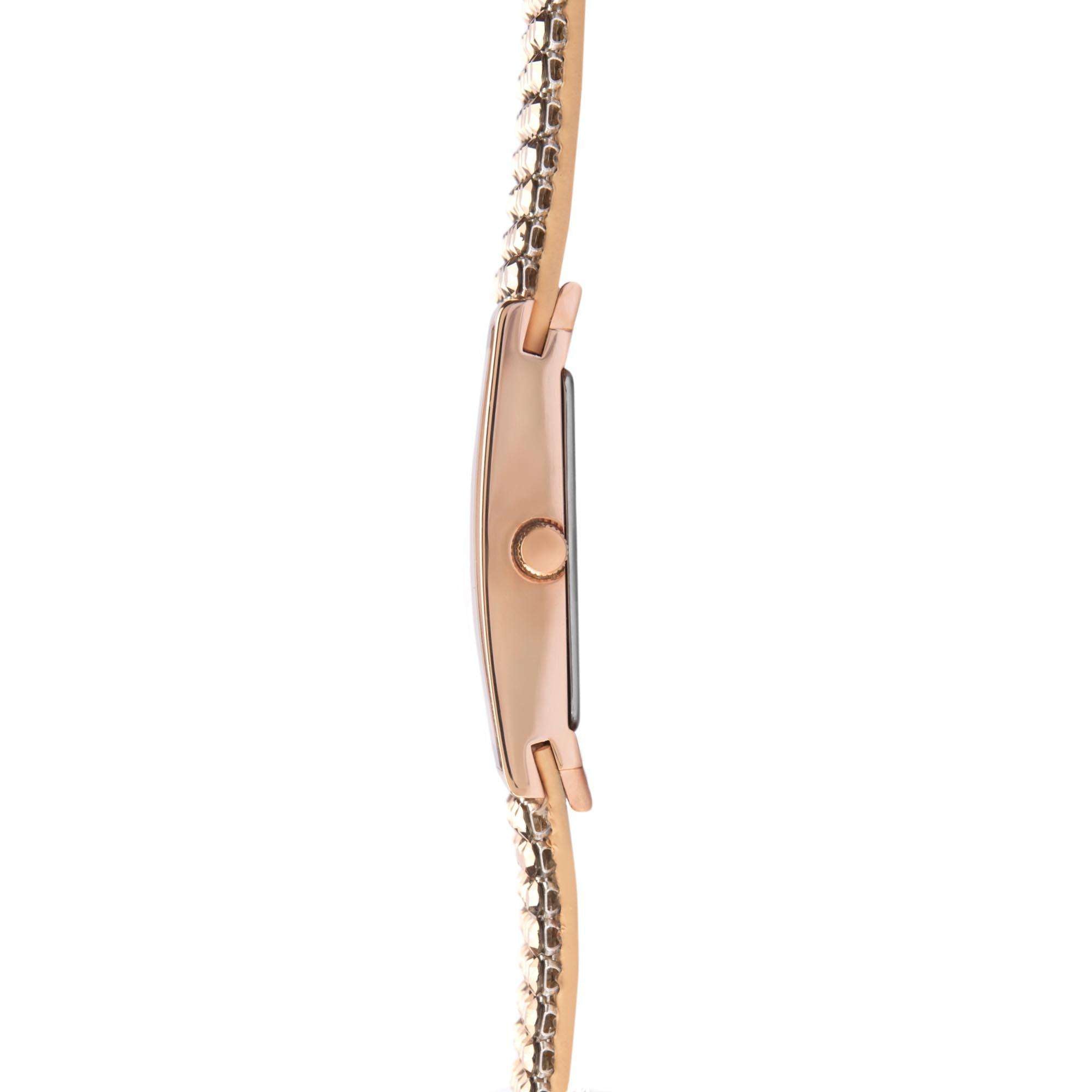This Seksy Dress Quartz Rose Gold Watch 2850 watch features a rose gold PVD brass tonneau style case. It has been treated to a polished finish, it features a fixed bezel and a crown at 3 o’clock. Mineral glass provides the watch with protection against scratches and shattering.