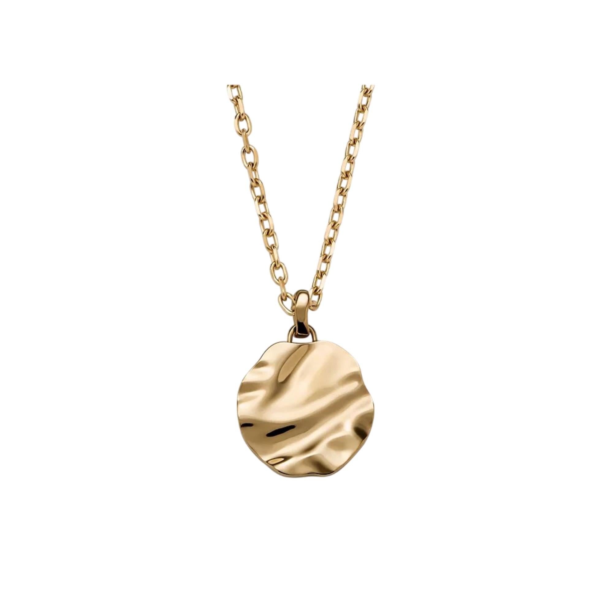 Crafted for both style and comfort, this pendant necklace boasts a lightweight feel, making it an ideal accessory for everyday wear or special occasions. The subtle yet distinct wave texture on the medallion provides a captivating interplay of light and shadow, adding depth and character to its sleek form. Designed for convenience, the necklace is secured with a reliable lobster clasp, ensuring an adjustable and secure fit that allows the pendant to lie perfectly, enhancing your natural elegance.