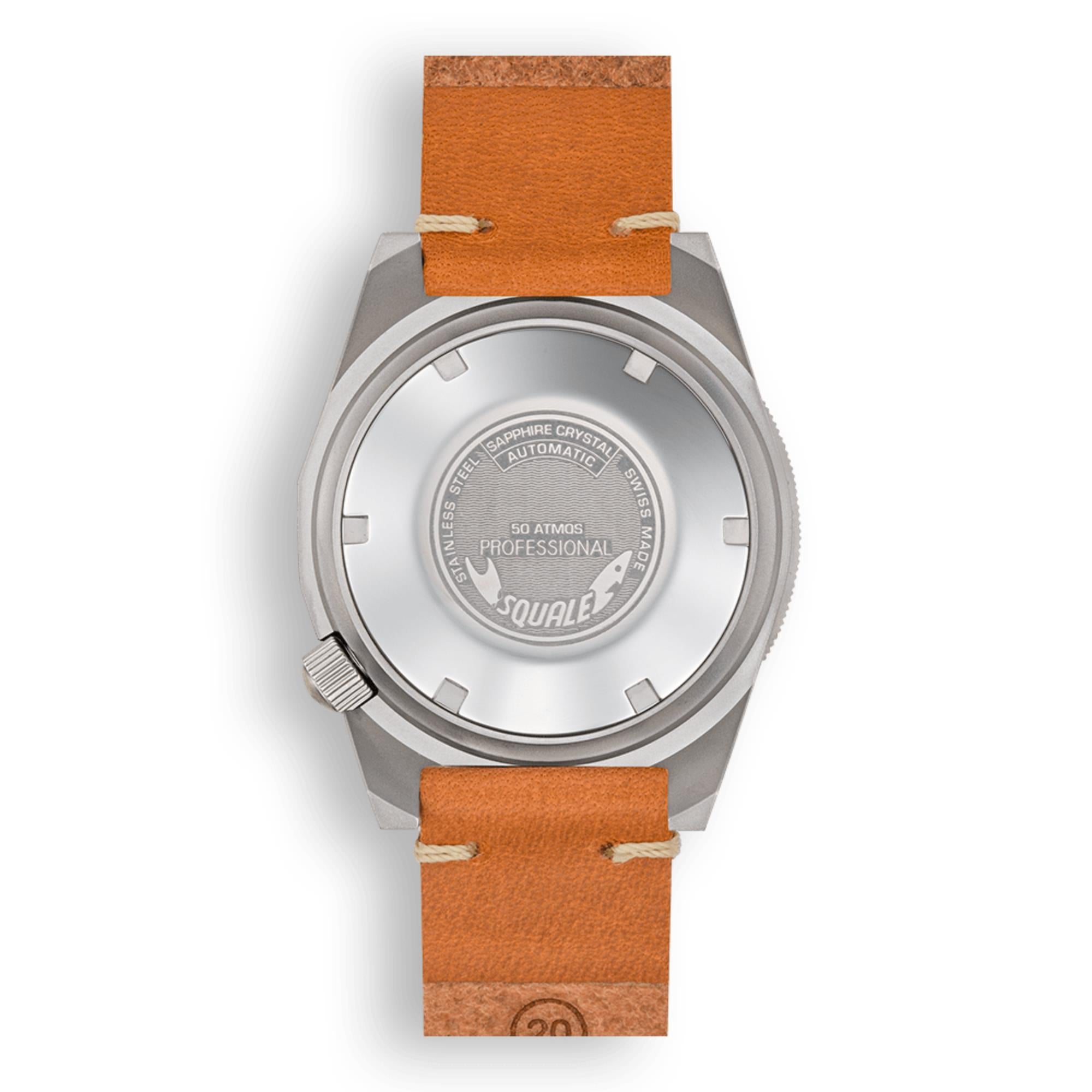 Case Back: Solid – Deeply engraved with Squale's shark logo and model details.