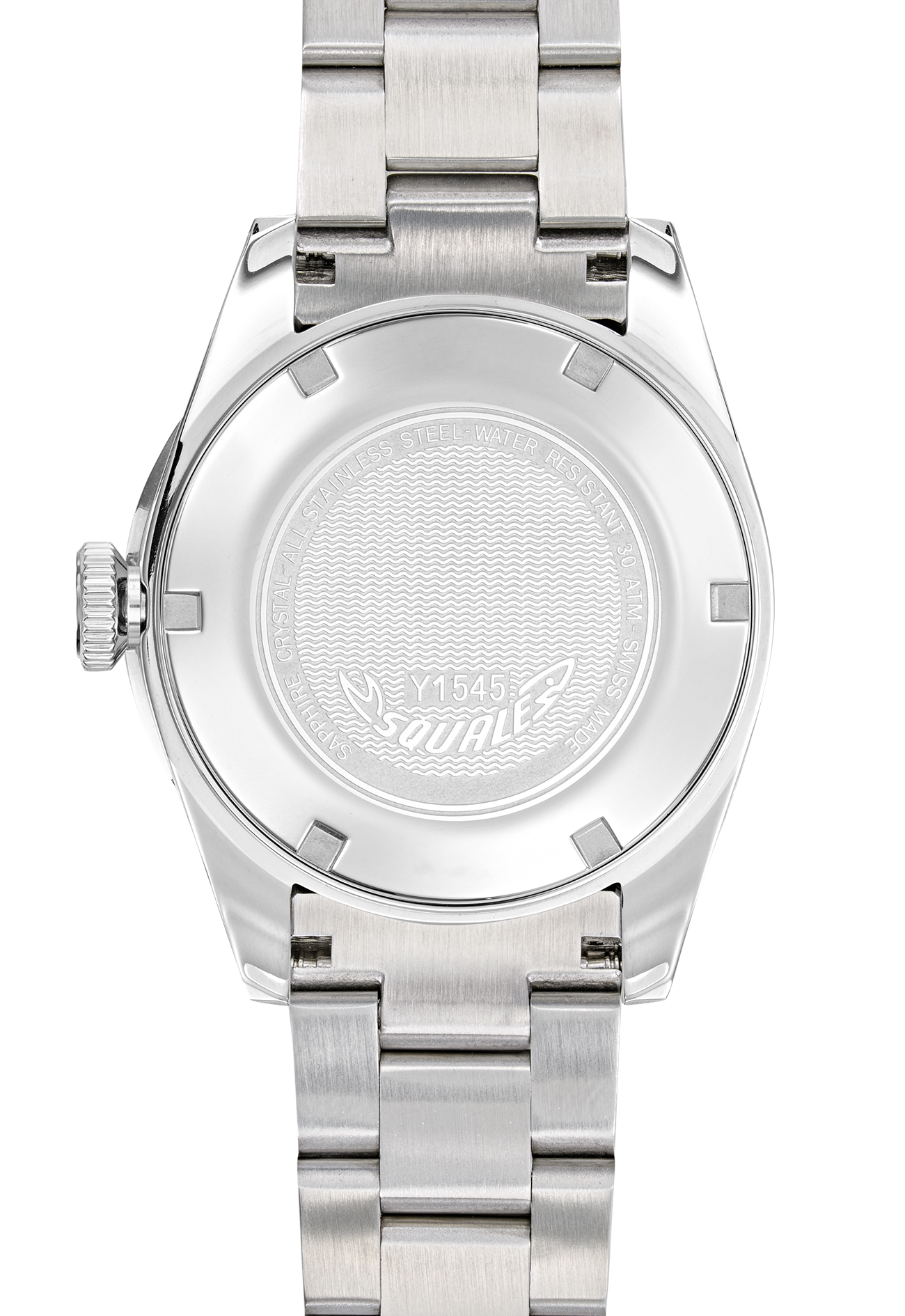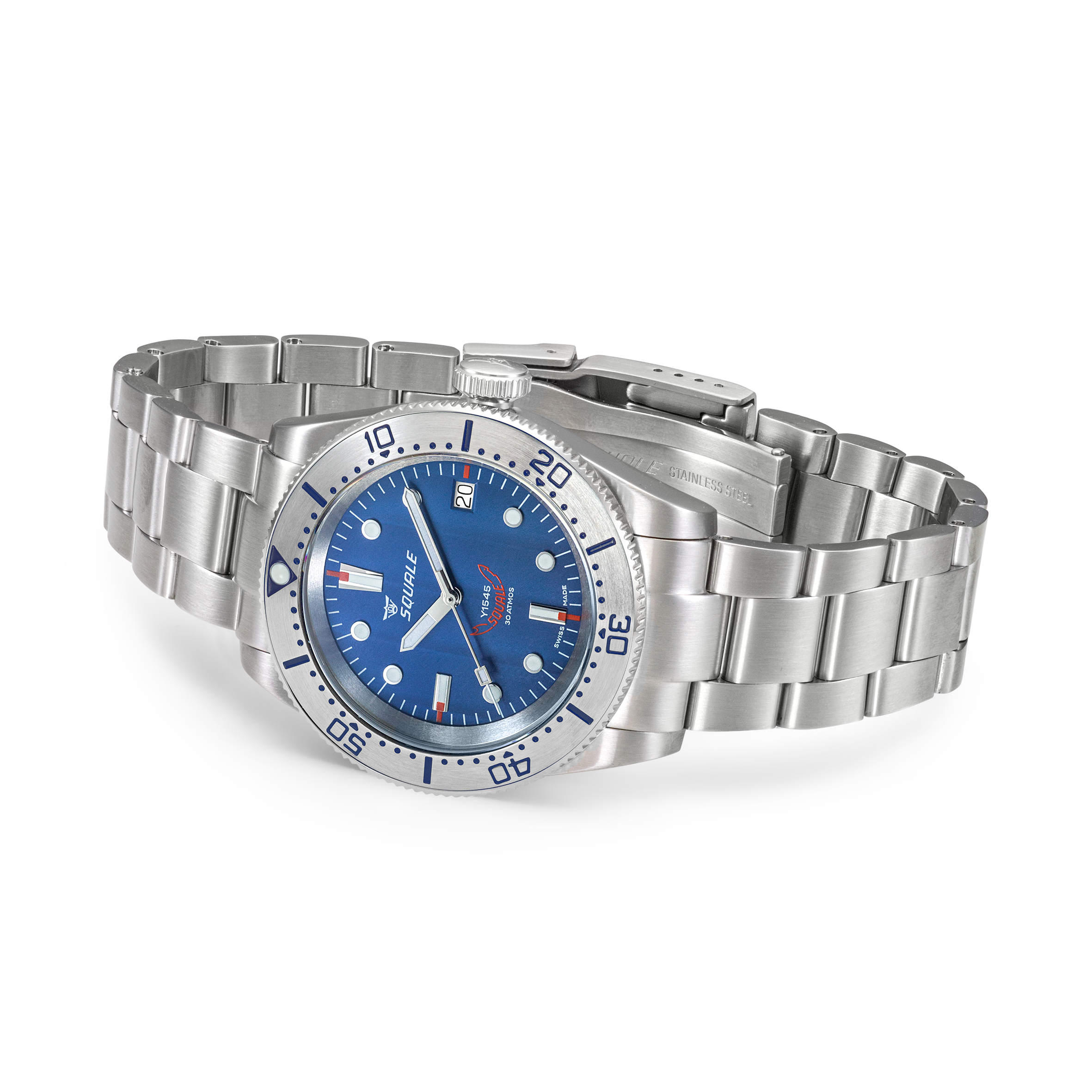 The dial is presented in blue and showcases a highly legible design. It features a combination of silver-framed, highly luminous Superluminova C3 circular and baton-style hour markers that absorb and store light energy, subsequently emitting it as a glow in even the darkest depths of the ocean. The hour markers are encircled by a 60-minute track that is presented through thin white baton-style minute markers. A date wheel is located beside the 3 o’clock marker. The baton-style handset is also coated in Superluminova C3. The Squale shark logo, synonymous for reliable dive watches, can be found at the 6 o’clock position.
