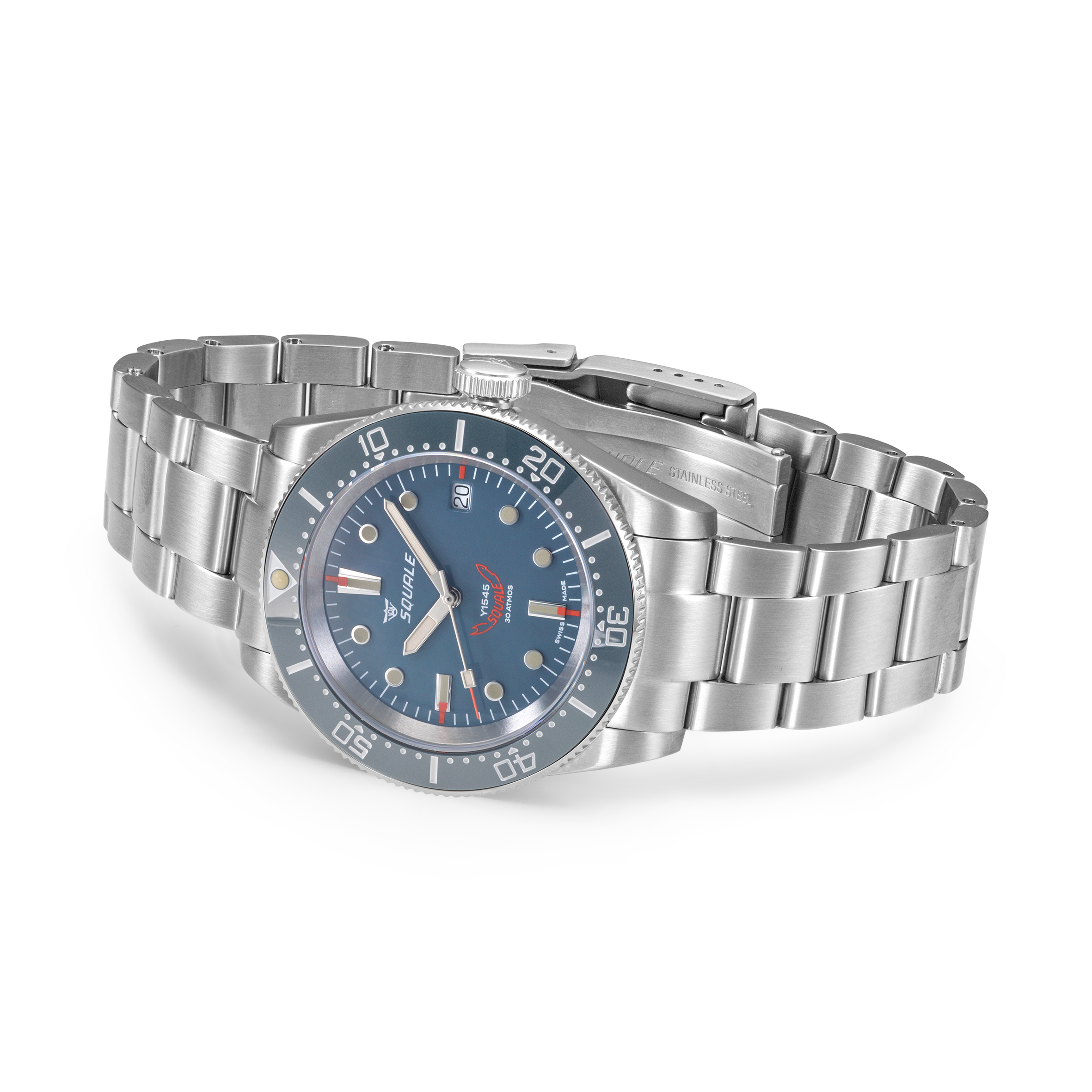 The dial is presented in grey and showcases a highly legible design. It features a combination of silver-framed, highly luminous Superluminova C3 circular and baton-style hour markers that absorb and store light energy, subsequently emitting it as a glow in even the darkest depths of the ocean. The hour markers are encircled by a 60-minute track that is presented through thin white baton-style minute markers. A date wheel is located beside the 3 o’clock marker. The baton-style handset is also coated in Superluminova C3. The Squale shark logo, synonymous for reliable dive watches, can be found at the 6 o’clock position.