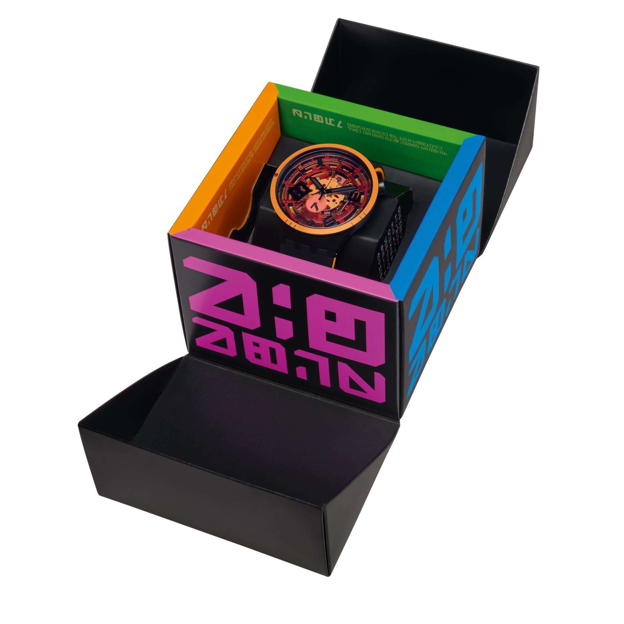 Big Bold Watch SB01B127 Black Silicone Strap Unisex is made from opac matte dark plastic and it measures 47mm in diameter and 11.75mm in height. The case is brought to life through the Solar Spectrum which is applied to the case of the watch and highlighted by contrasting bright fluo colored elements. The case is completed by a push button which is located beside the 2 o’clock position and the orange printed frame on the bezel. Raised mineral glass sits on top of the case, providing protection to the dial.