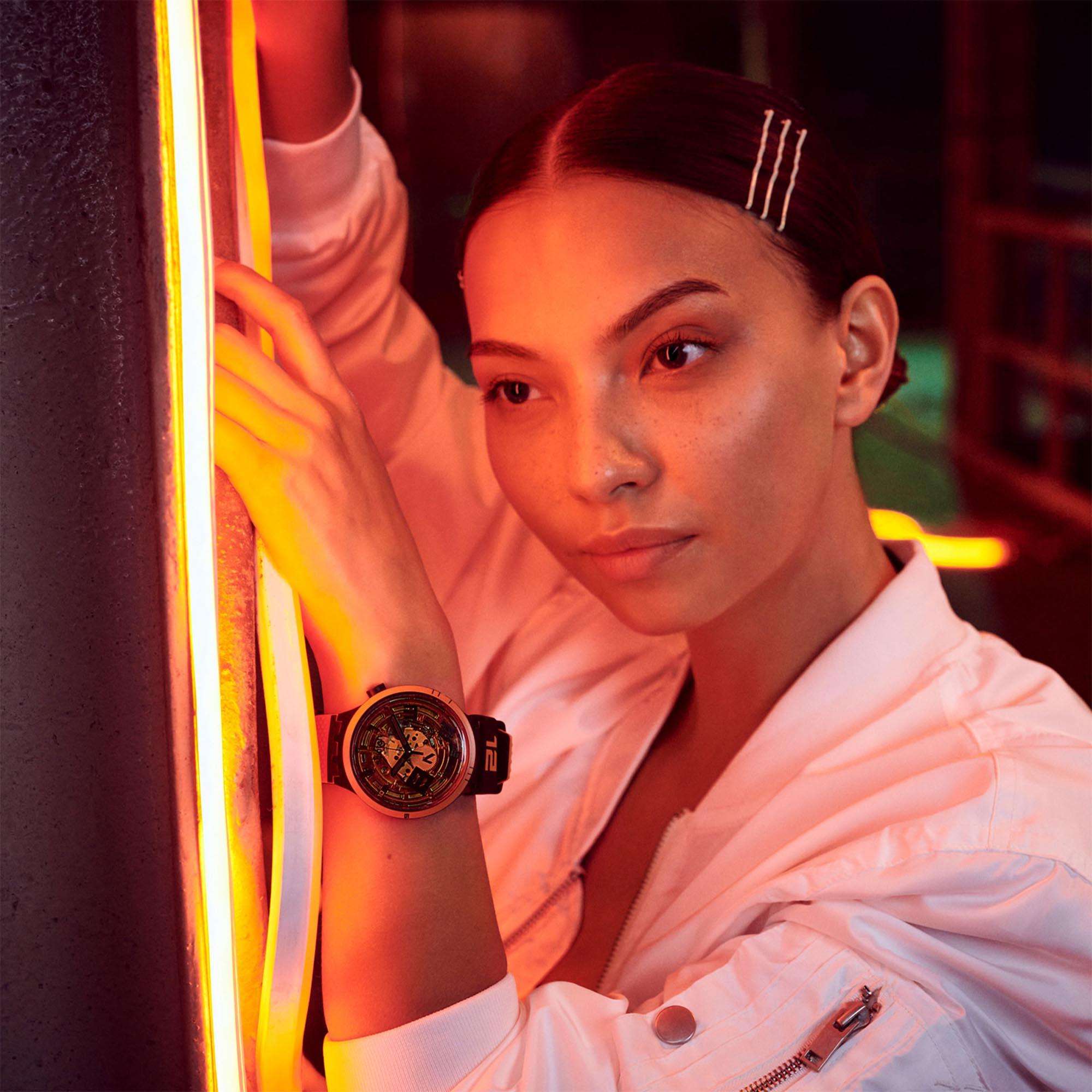 The transparent dial gives the wearer a direct insight into the complex inner workings of the watch that are presented in an orange iridescent tone. Moreover, the dial also exhibits a combination of Arabic and baton style indices and black baton hour, minute and second hands. The logo is positioned neatly beneath the 12 o’clock marker.