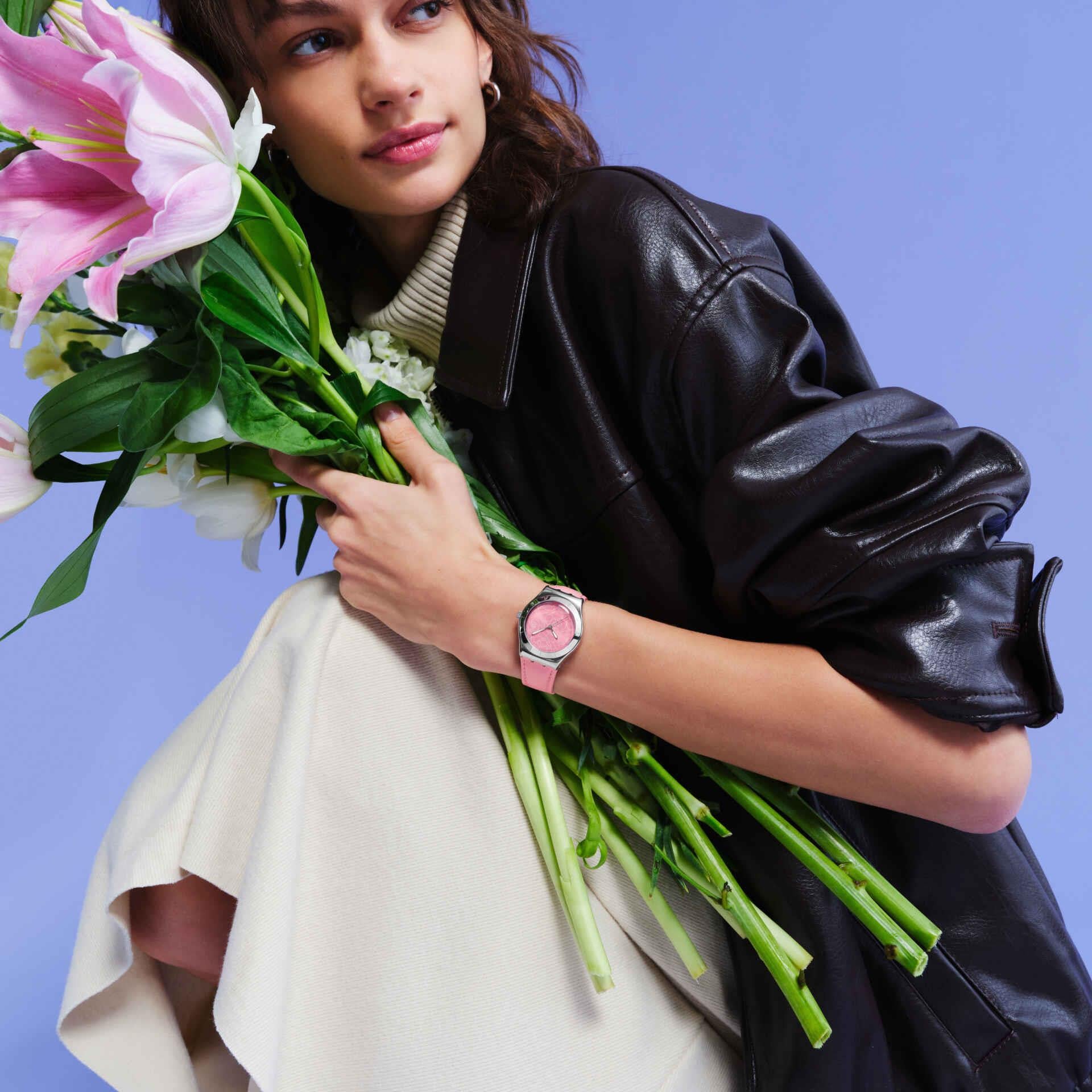 Swatch Pink Petal Promise Pink Dial Leather Strap Unisex Watch (YLS234)