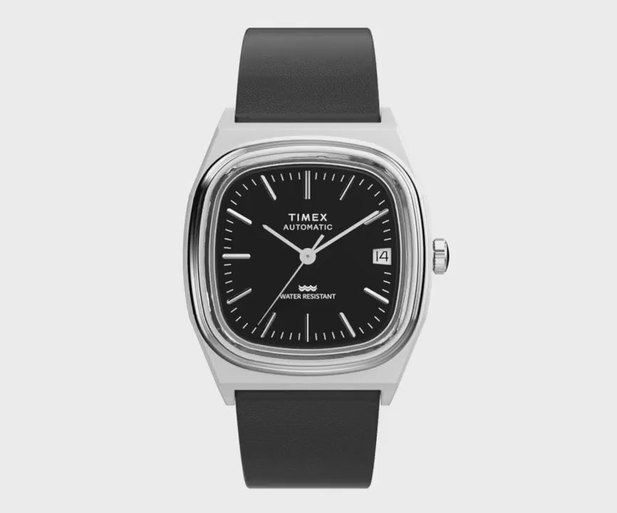 The Timex Automatic 1983 E Line TW2Y07500 revisits a distinctive era of design with a subtle, modern refinement. Encased in a 34mm polished and brushed stainless-steel case, this model evokes the classic “TV-dial” aesthetic of its original 1983 predecessor. A black dial presents clean hour markers and a discreet date window at 3 o’clock, beneath a flat acrylic crystal that lends vintage character and unobtrusive clarity.