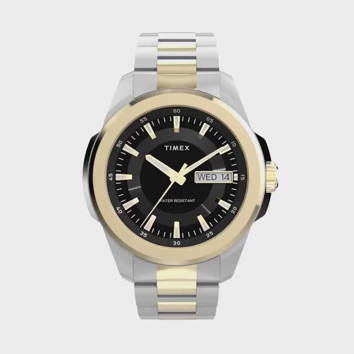 The Timex Essex Avenue Day-Date 45mm presents a standout combination of polish and presence. With its generous 45mm brushed-and-polished stainless-steel case, it commands attention yet remains refined. The two-tone finish silver and gold-tone adds a touch of sophistication that transitions effortlessly from boardroom to weekend outing. The dial features a subtle circular inlay, luminous markers and hands for enhanced readability in low light, and a dual day-and-date window that offers practical utility each day.