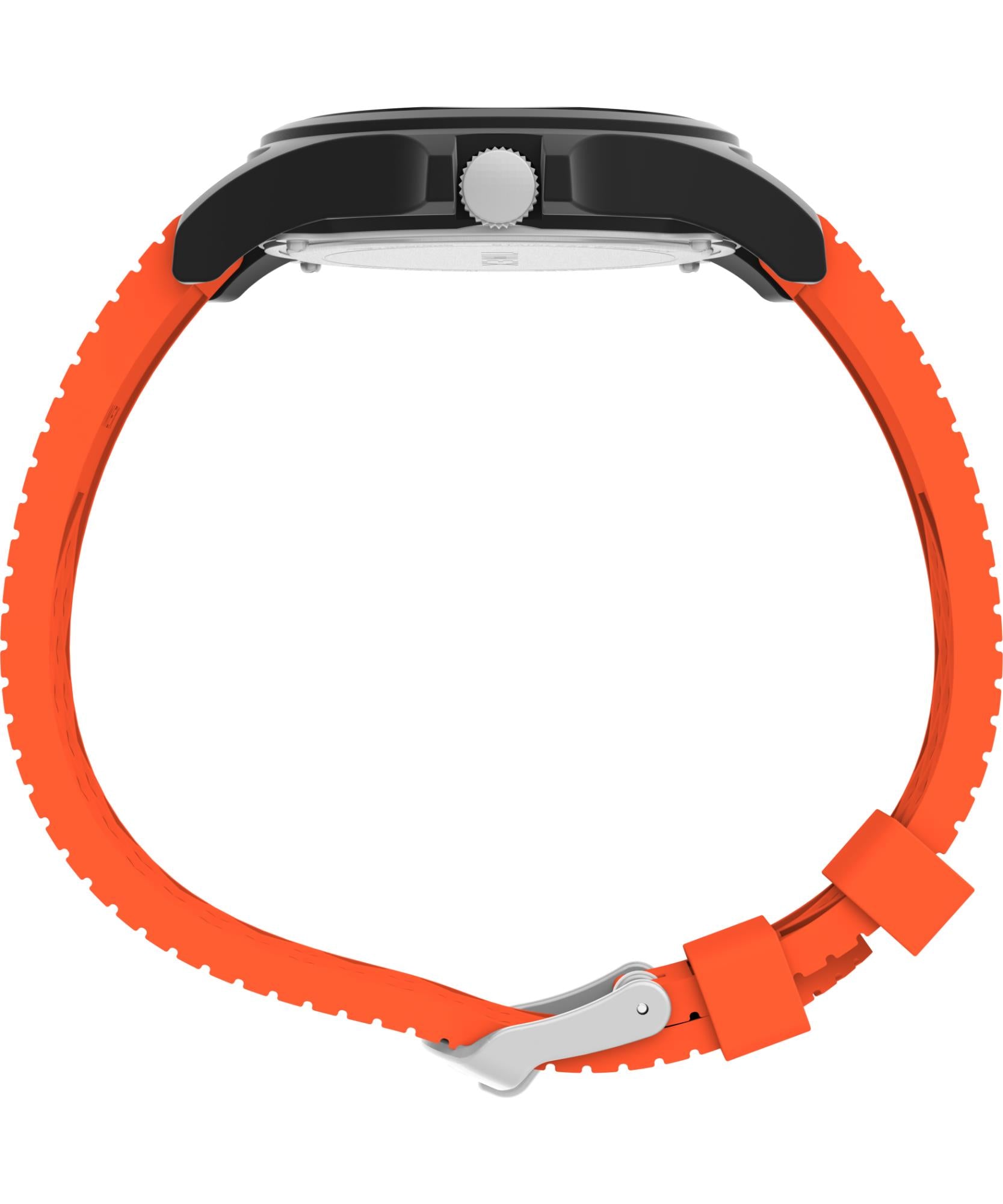 The Timex Main Street NASA Artemis TW2Y13000 channels space-age inspiration with playful design and everyday durability. Its 40mm black resin case provides a bold, lightweight presence, while the matching orange silicone strap adds vibrant contrast and a sporty edge. The white dial stands out cleanly, featuring black hour and minute hands, a red seconds hand, and the iconic NASA “Artemis” logo — a distinctive visual nod to exploration. The Plexi crystal adds a vintage warmth, softening reflections and giving character to the overall look.