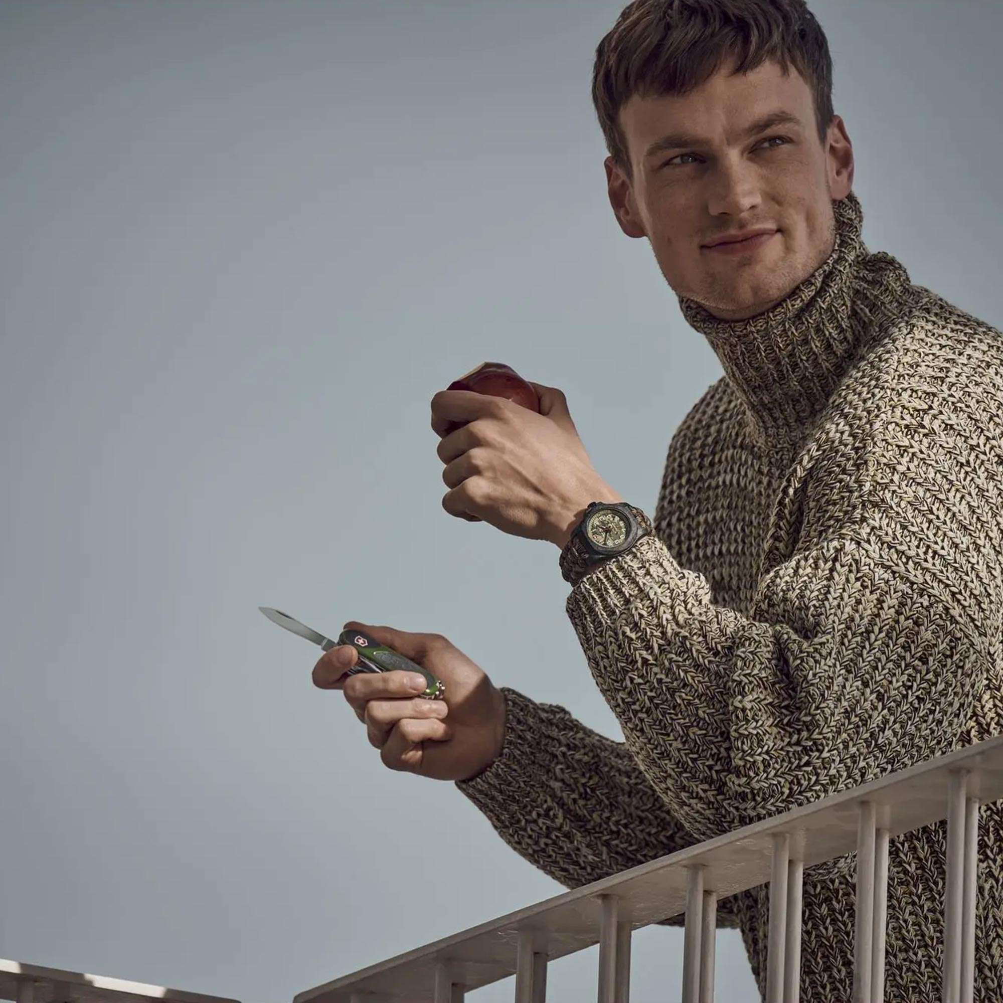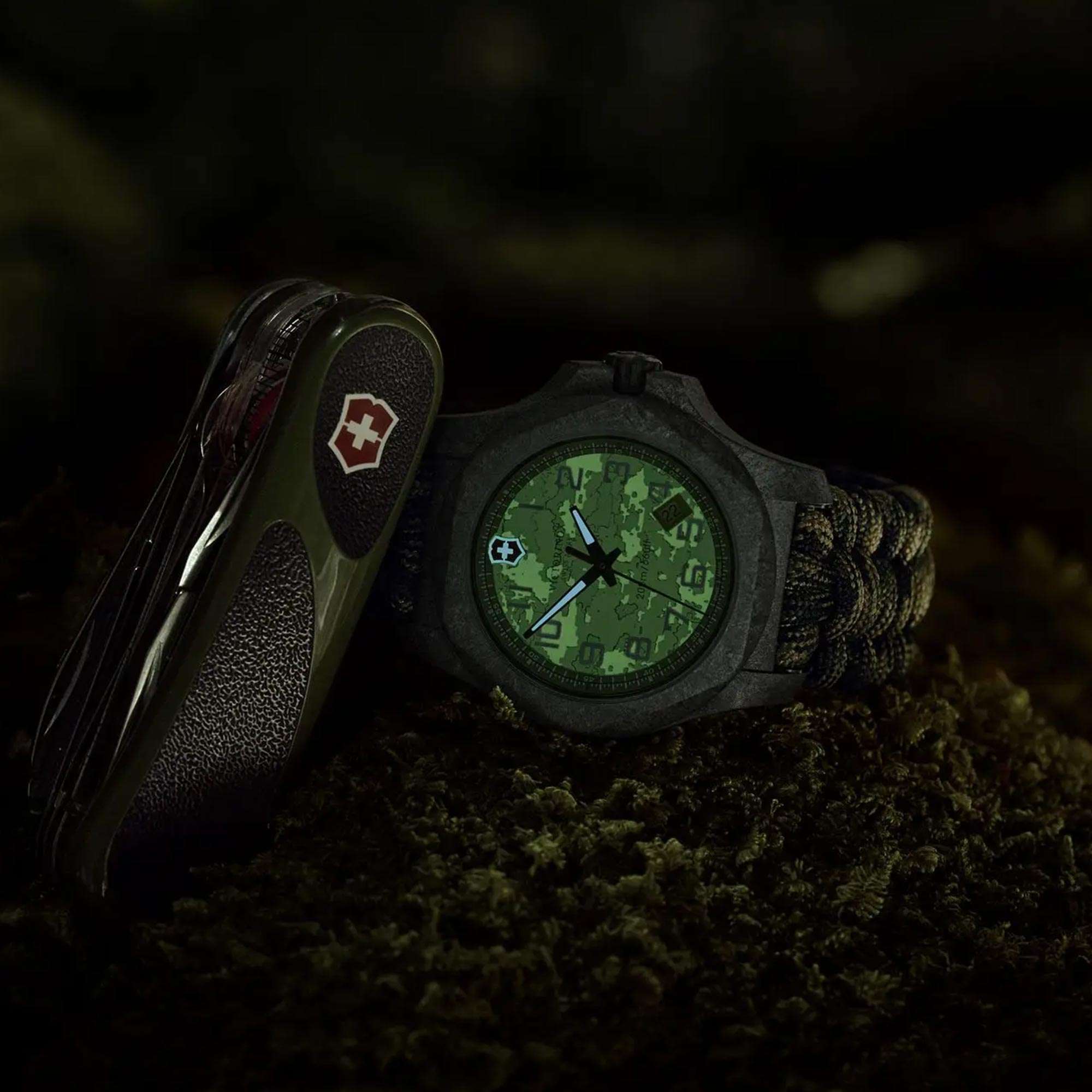 The dial of the Victorinox I.N.O.X. Carbon Limited Edition is a key element. Coming in a camouflage pattern that is green in colour, it is graced with highly legible numbers and a date window at five o’clock. The bright hands and numerals have SuperLuminova® luminescent technology for 24/7 readability and, as always, the iconic Victorinox logo at twelve brings depth and esteem.