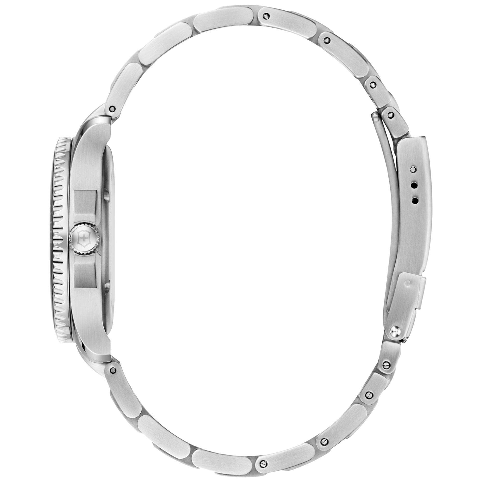 The Victorinox Maverick 241701 is the perfect blend of elegance and function. The 34mm case is crafted from high-grade Swiss made stainless steel. Whilst the black PVD coated stainless steel unidirectional bezel is as alluring as it is practical. The edge of the bezel is knurled, which allows the wearer to easily rotate it. A lume pip is present at the 12 o'clock mark on the bezel, whilst second increments form a track around the rest of the bezel. An embossed screw down crown is also positioned besides the 3 o'clock mark, it is protected by a crown guard. Triple coated anti reflective sapphire crystal glass that protects the dial against sun and water damage.